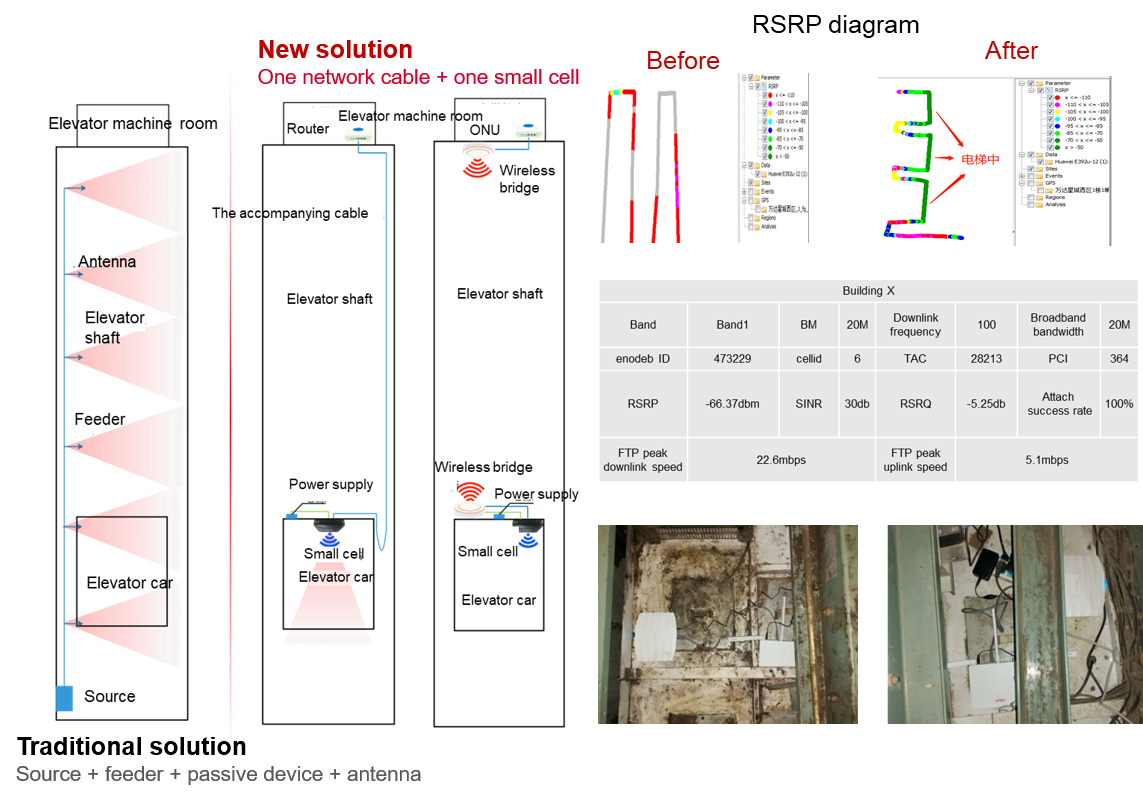 This solution uses a Sunsea 125mW integrated small cell, which is transmitted between the elevator shafts through a wireless bridge and is accessed by broadband at the back end of the cell, which easily realizes a network cable + a small cell to complete an elevator coverage.
